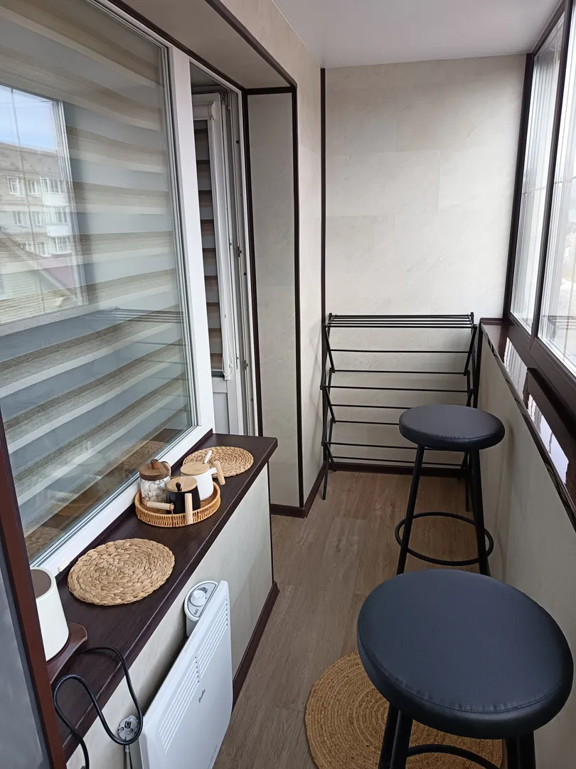 В 2025г сделан ремонт на лоджии, стены утепленные, зимой можно дополнительно включить обогреватель. Так что, зимой и летом можно попить кофе на лоджии, сидя на барных венских стульях